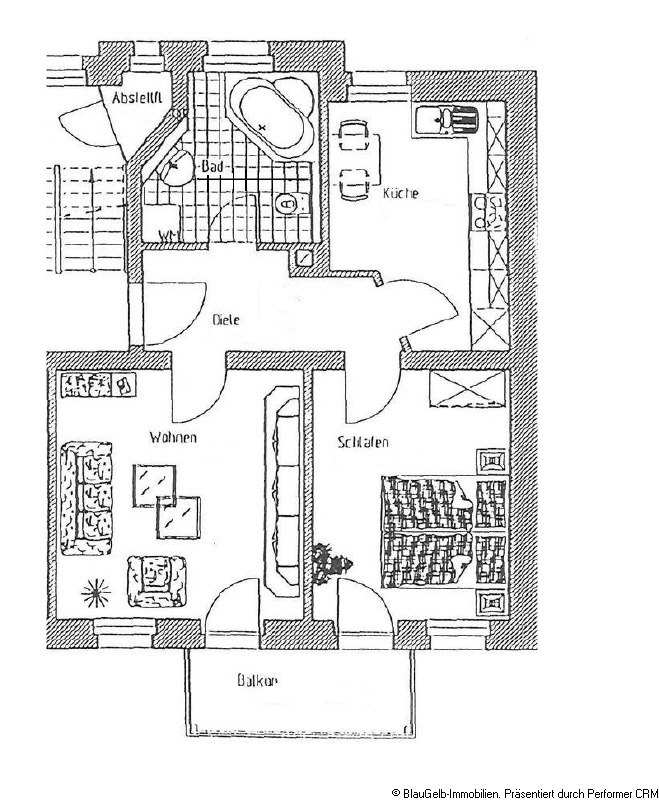 Die Wohnung verfügt über einen klassischen Grundriss, alle Räume erreicht man vom Flur. Das Tageslichtbad verfügt über Eckbadewanne. Die Fußbodenbeläge der Wohnung sind mit Laminat und Fliesen ausgestattet. In der einladenden Wohnküche ist eine Einbauküche vorzufinden.
